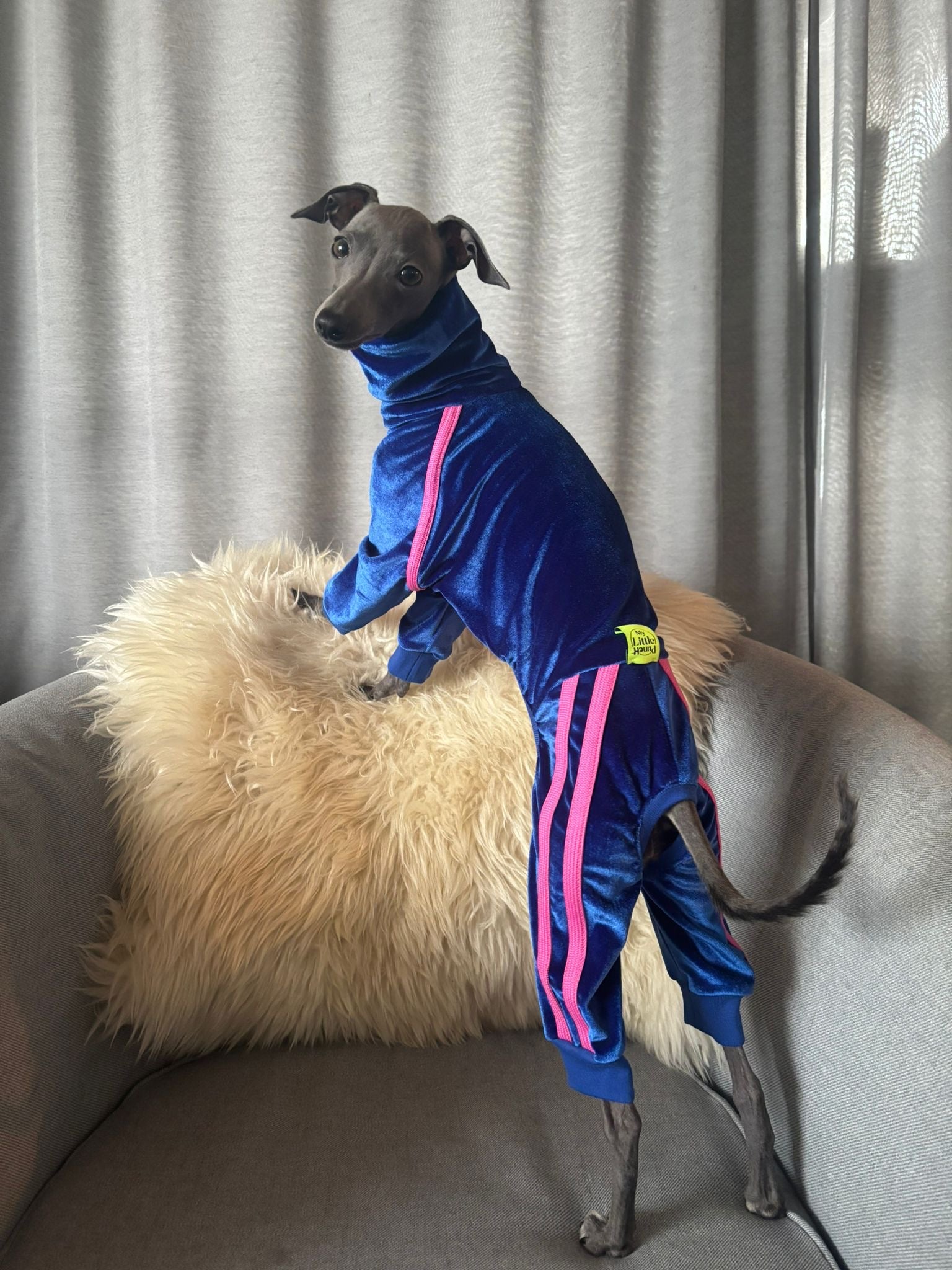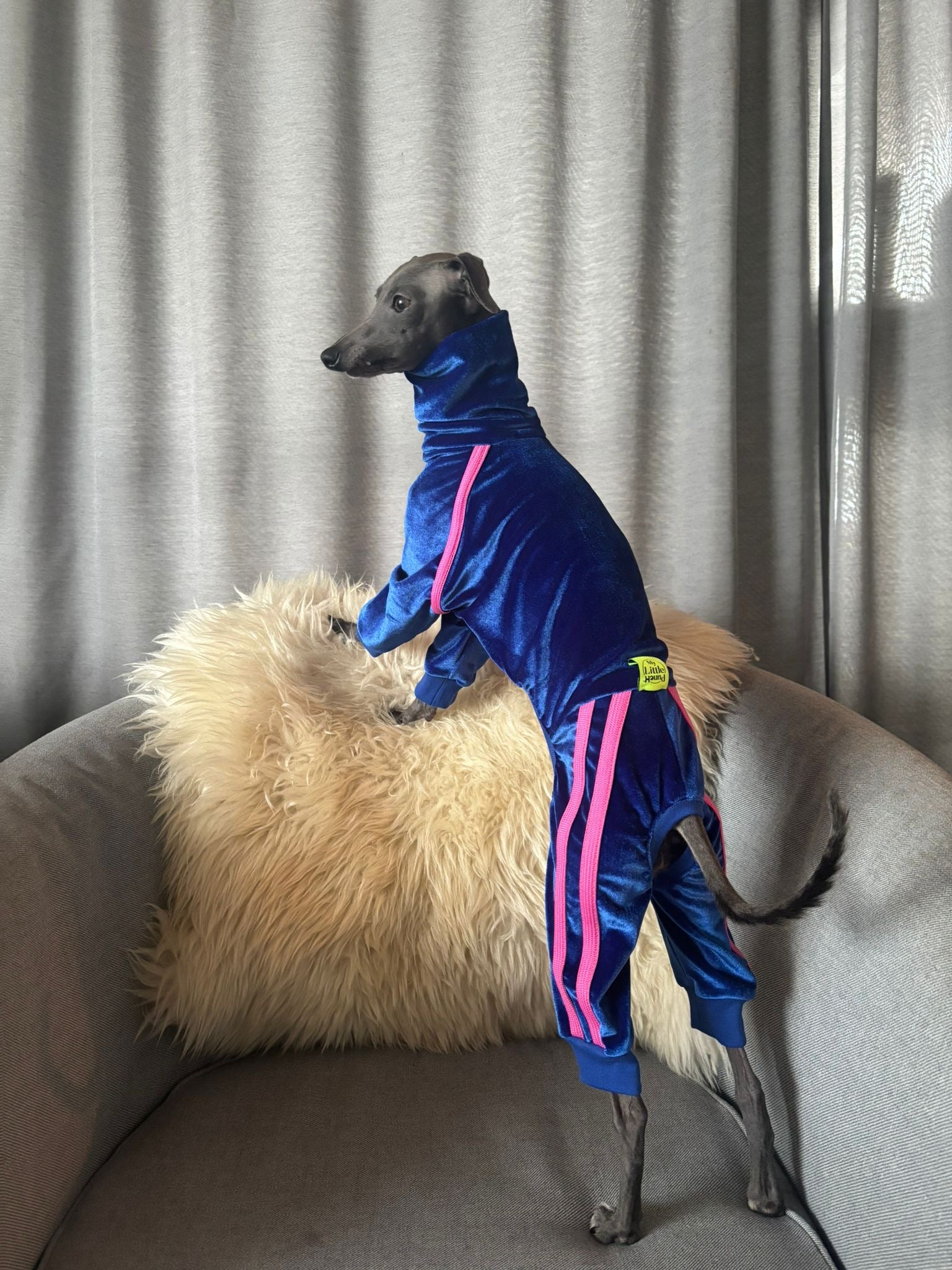 The fit was specially developed for the elegant body shape of Italian Greyhounds and other sighthounds . Soft seams, elastic leg openings and a high collar ensure maximum comfort, freedom of movement and a secure fit all around – even at high speeds.